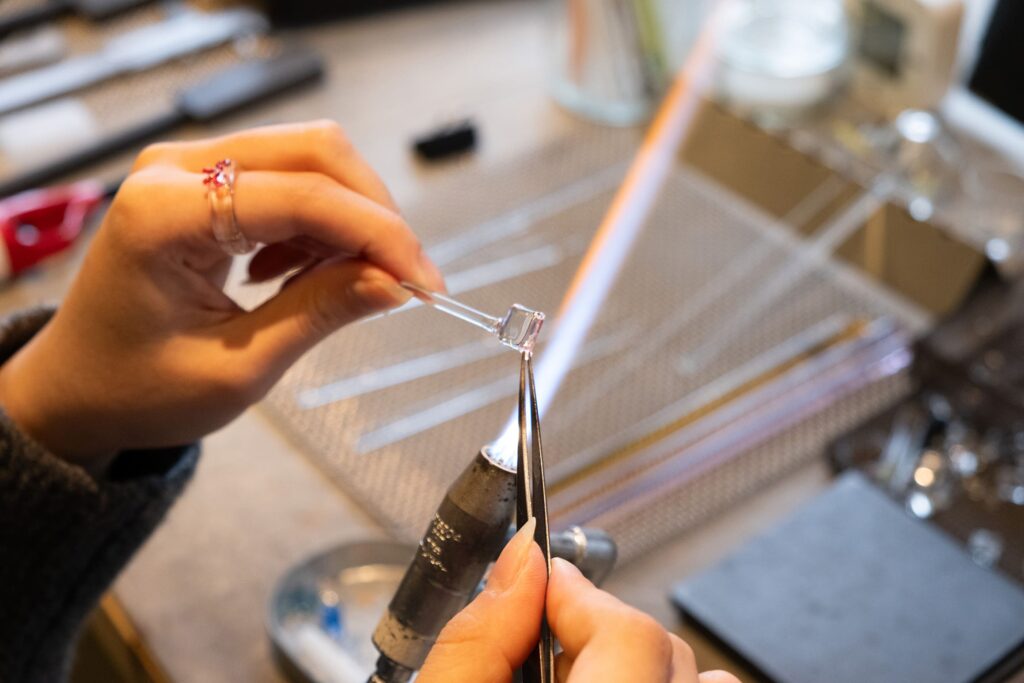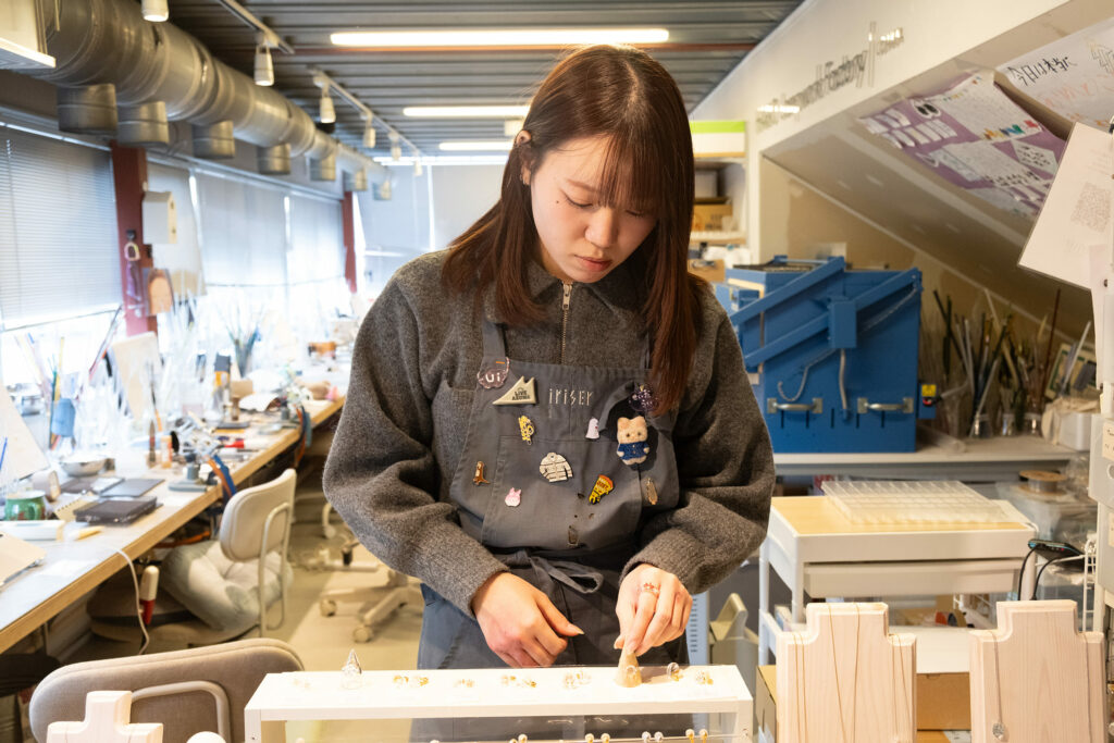 「吹きガラスに憧れていたのですが、いざやってみるとガラスも道具も重たくて想像以上に大変でした。作業時の熱さも強烈で、仕事にするならバーナーワークを選びたいと思ったんです。アクセサリー作りにも興味があり、就活中に出会ったのがイリゼでした」(清田さん)