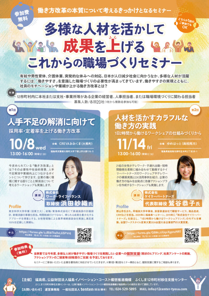 子育て、介護等によりフルタイム勤務を望まない女性のキャリア構築を目的に、「1日2時間から働ける」仕組みで運営するケイリーパートナーズ。現在、21名の女性がテレワーク・子連れ出勤・短時間勤務を柔軟に組み合わせて勤務しています。セミナーでは、ワークシェアやテレワークの構築実践とDX活用事例を紹介。さらに、参加企業の働き方の悩みを出発点に改善アクションプランを作成するワークショップと、白河市内企業で実際に行われた働き方改革事例(「白河市 女性に寄り添うライフ・ワークサポート事業」)もご紹介します。