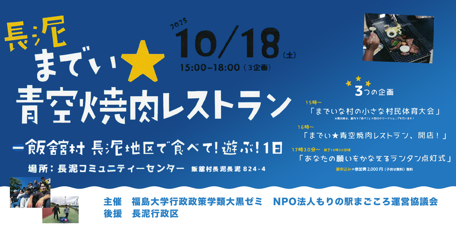 4. 主催・後援 | 【主催】福島大学行政政策学類大黒ゼミ/NPO法人もりの駅まごころ運営協議会 【後援】飯舘村長泥行政区/飯舘村商工会 ※長泥行政区、商工会青年部の皆さまに全面的にご支援いただいています。 |