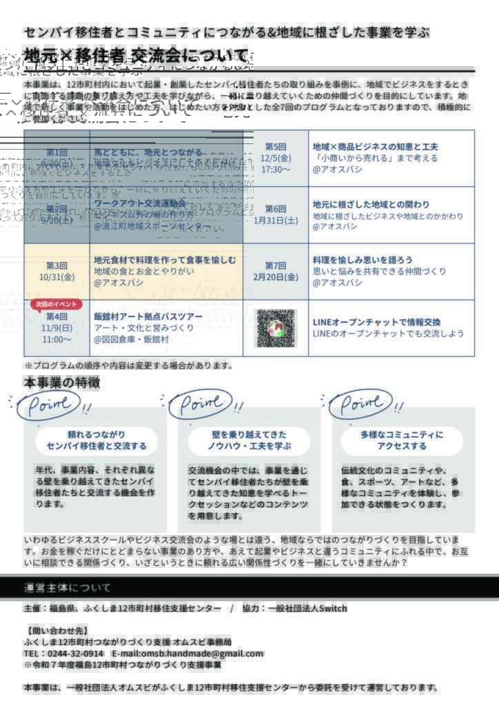 10. 問い合わせ | ふくしま12市町村つながりづくり支援 オムスビ事務局 TEL:0244-32-0914 E-mail:omsb.handmade@gmail.com ※ 令和7年度福島12市町村つながりづくり支援事業 本事業は、一般社団法人オムスビがふくしま12市町村移住支援センターから委託を受けて運営しております。 |