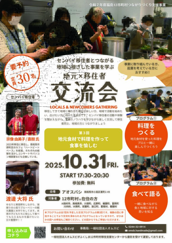 1. 開催日程 | 第1回 8/30(土) 馬とともに、地元とつながる ←終了しました 第2回 9/20(土) ワークアウト交流運動会 第3回 10/31(金) 地元食材で料理を作って食事を愉しむ ←今回はこちら 第4回 11/9(日) 飯舘村アート拠点バスツアー 第5回 12月頃 地域×商品ビジネスの知恵と工夫 第6回 1月頃 地元に根差したビジネスや地域とのかかわり 第7回 2月頃 料理を愉しみ思いを語ろう LINEオープンチャットで情報交換 |