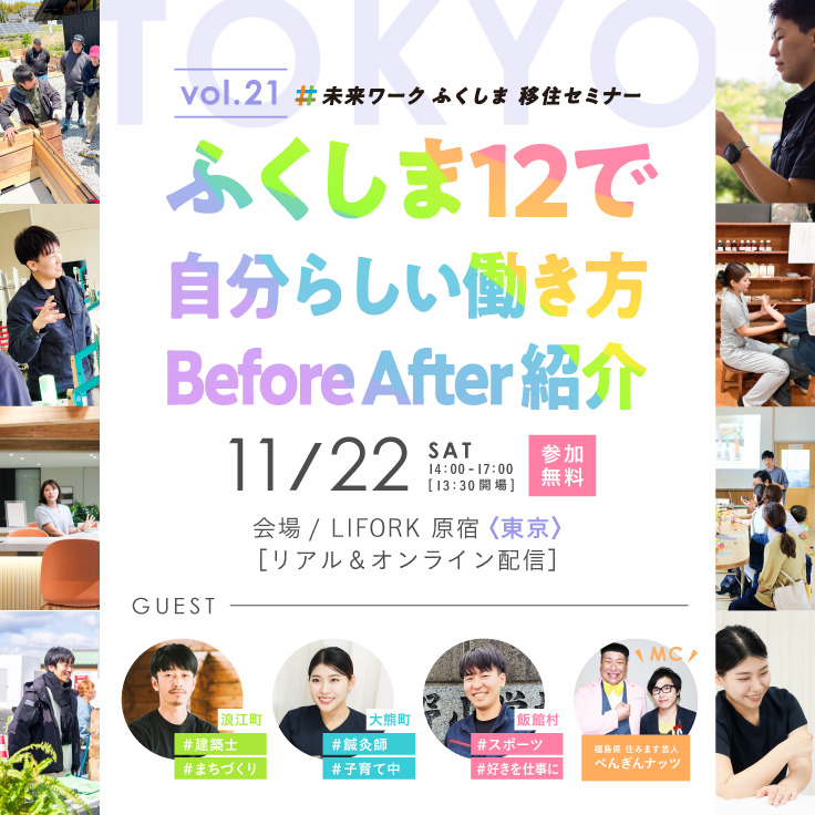 本セミナーでは、「移住」や「転職」といった選択肢を、もっと自由に、柔軟に考えていただけるように、福島12 市町村に移り住み、新しい働き方を実現された方々の 移住前(Before)と移住後(After) で何が変わったかの具体的な変化をご紹介。