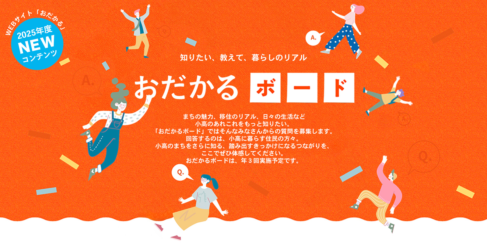 1. 実施期間 | 以下の日程で全3回の実施を予定しております。 ◎第1回 ・質問受付期間: ・回答期間:2025年10月2日~10月15日 ◎第2回 ・質問受付期間:2025年11月20日~11月26日 ・回答期間:2025年12月4日~12月17日 ◎第3回 ・質問受付期間:2026年1月15日~1月21日 ・回答期間:2026年1月29日~2月11日 ※回答期間中は、回答内容が順次追加されます。 各回の開催については、おだかるの Instagramアカウントでも発信予定ですので、 ぜひチェックしてみてください。 |