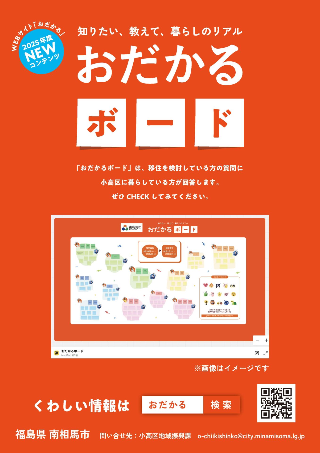 3. 問い合わせ | 福島県南相馬市 小高区役所 地域振興課 おだかぐらし担当 TEL:0244‐44‐6716 MAIL:o-chiikishinko@city.minamisoma.lg.jp |