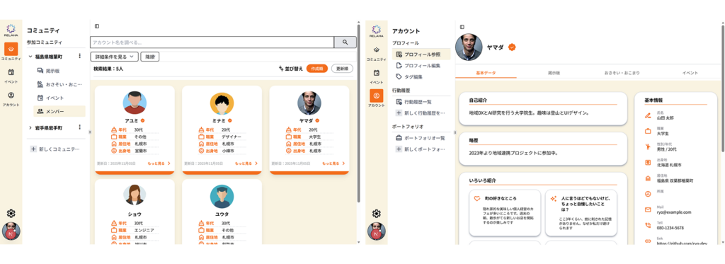 私たちは2022年度より、福島県楢葉町において、町に愛着をもって継続的に関わる「愛着人口」の増加を目指して活動している。その一環として、町民同士や町内外の人をつなぐアプリ「Relaha」を開発中。町の情報が可視化されたアプリ内で、町民の身近な悩みや、企業・地域が抱える課題、気軽なお誘いを起点に多くの人がつながり、継続的な関係が生まれることを目指している。