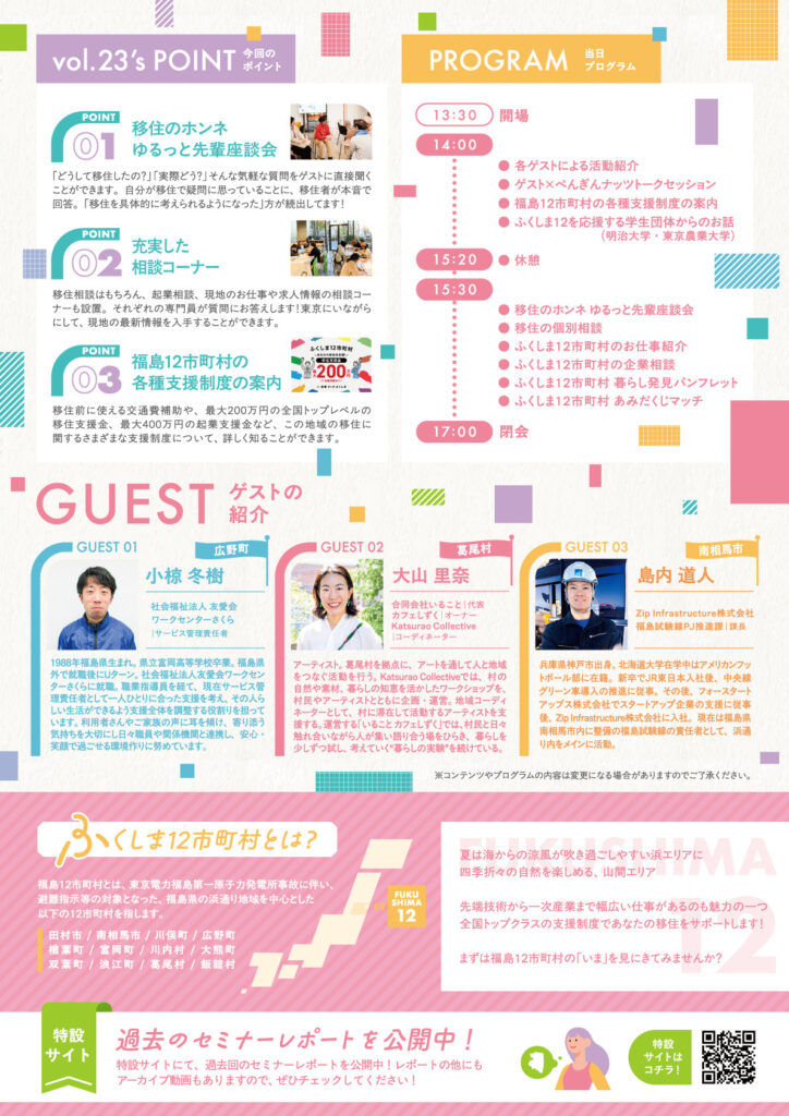 | 15:30 | ・移住のホンネ ゆるっと先輩座談会 ・個別相談(移住・仕事紹介・起業) ・ふくしま12体験コンテンツラリー ・ふくしま12市町村 暮らし発見パンフレット ・ふくしま12市町村 あみだくじマッチ ・ぺんナツちょい寄りカフェ |