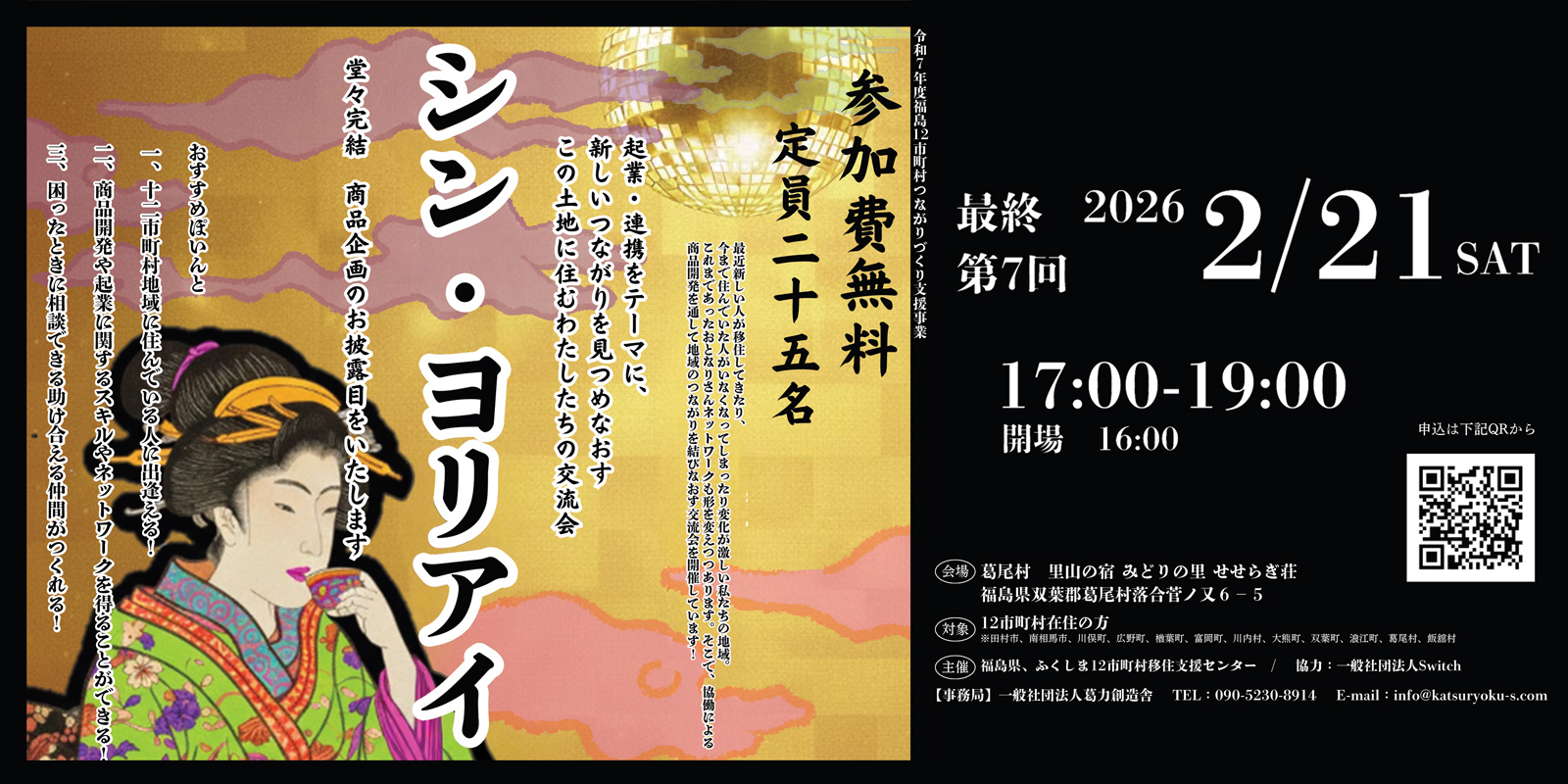 | 10. 問い合わせ | ふくしま12市町村つながりづくり支援 葛力創造舎事務局 TEL:090‐5230‐8914 E-mail:info@katsuryoku-s.com ※令和7年度福島12市町村つながりづくり支援事業本事業は、一般社団法人葛力創造舎がふくしま12市町村移住支援センターから委託を受けて運営しております。 |